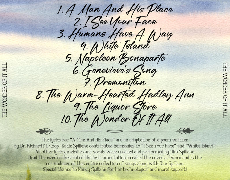 ~ The Wonder Of It All ~The PlayersJim Spillane • Vocals/Background VocalsKatie Spillane • Background Vocals on "I See Your Face" and "White Island"A Man And His Place • Quinn Bachand/Guitars; Andrew Morris/Percussion; Brad Thrower/Bass and Guitars I See Your Face • Jason Roller/Guitar; Darin Favorite/Lead Guitar; Miles Black/Piano; Brad Thrower/Bass, Drums and KeyboardsHumans Have A Way • Jeff Taylor/Piano; Miles McPherson/Drums; Pat McGrath/Guitar; Brent Mason/Lead Guitar; Brad Thrower/BassWhite Island • Mike Rojas/Piano; Shannon Forrest/Drums; Brent Mason/Guitars; Brad Thrower/BassNapoleon Bonaparte • Miles Black/Piano; Darin Favorite/Guitar; Dave Cleveland/Lead Guitar; Brad Thrower/Bass andGuitar Genevieve's Song • Miles Black/Piano; Fintan O'Brien/Guitar; Andy Leftwich/Fiddle; Brad Thrower/Bass, Guitar and PercussionPremonition • Zane Carney/Guitars; Dave Cleveland/Lead Guitar; Blair Masters/Piano; Brad Thrower/Bass and DrumsThe Warm-Hearted Hadley Ann • Andy Leftwich/Mandolin and Fiddle; Jason Roller/Guitar; John Jarvis/Piano; Brad Thrower/Bass, Drums and KeyboardsThe Liquor Store • Mike Rojas/Piano; Mike LeDonne/B3 Organ; Audley Freed/Guitar; Sol Philcox/Lead Guitar; Brad Thrower/Bass, Drums and Guitar The Wonder Of It All • John Jarvis/Piano; Jeff Taylor/Accordion; Brad Thrower/Bass, Drums and GuitarsAll songs written by Jim Spillane - All Rights Reserved